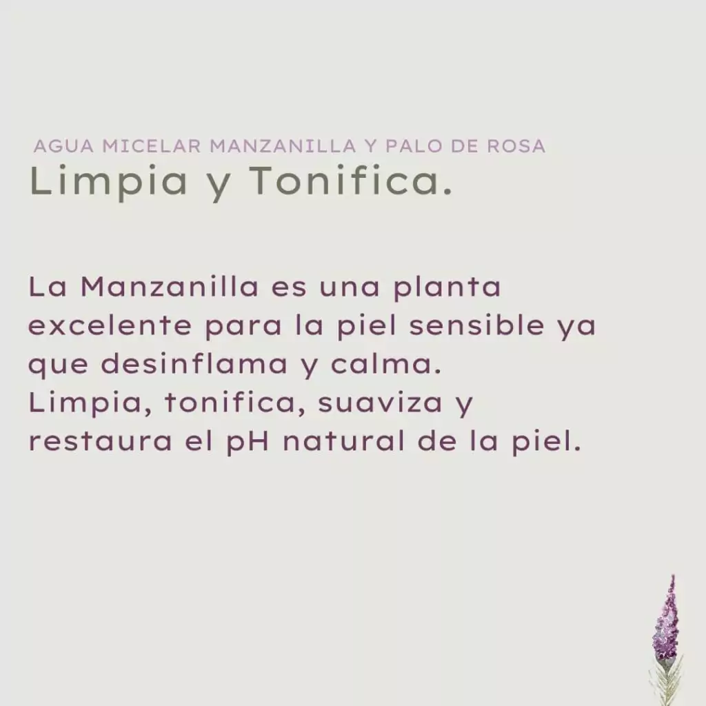 🧪Ingredientes: Agua bidestilada, hidrolato de manzanilla, aceite de almendras, coco glucosido, glicerina, conservante apto, aceite esencial puro de palo de rosa.